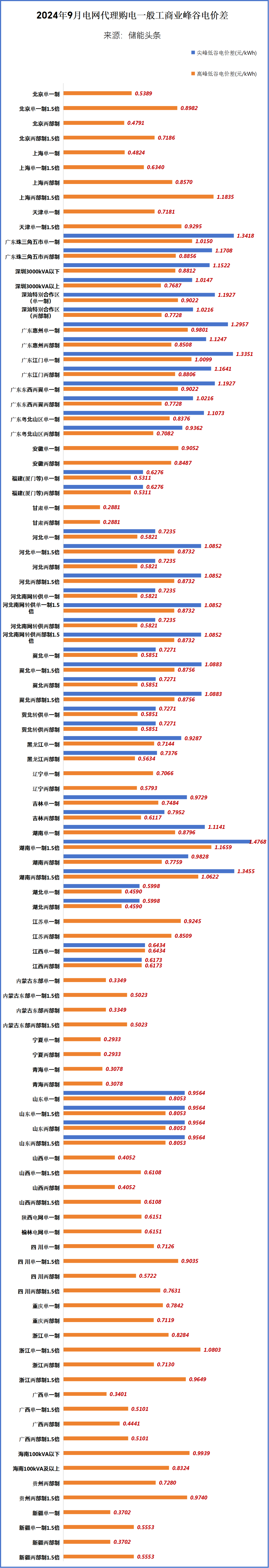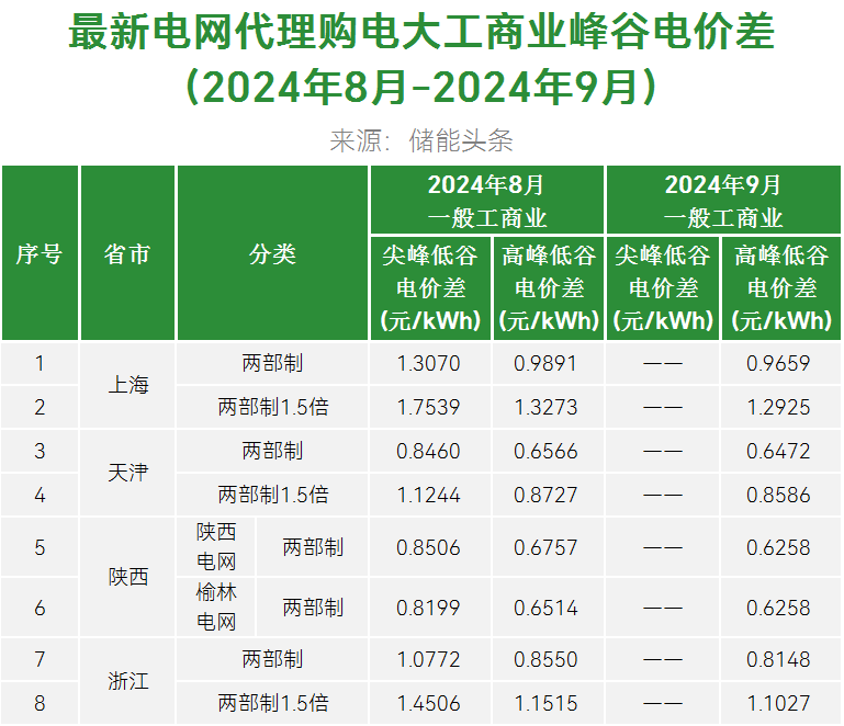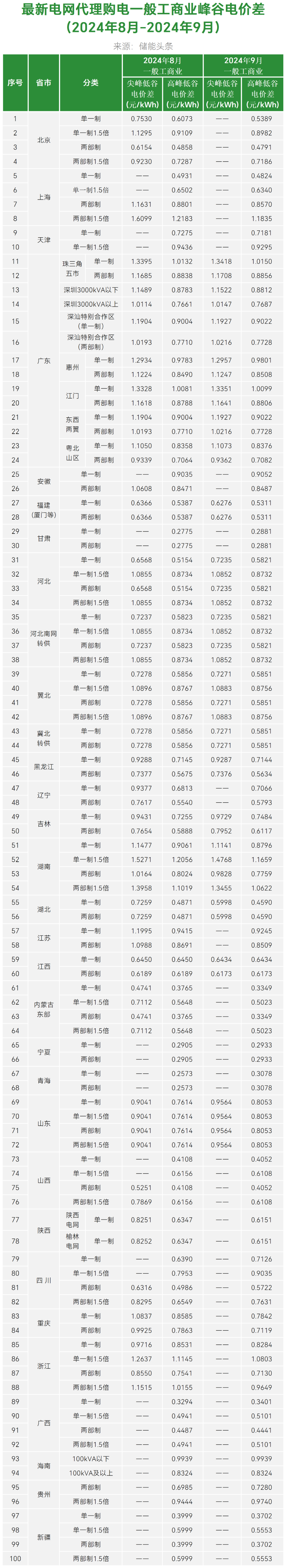 了解到,2024年9月电网代理购电价格中,全国峰谷价差最高的是湖南,执行一般工商业单一制1.5倍尖峰电价时,峰谷价差为1.4768元/kWh,比8月最高价格低0.3元/kWh。