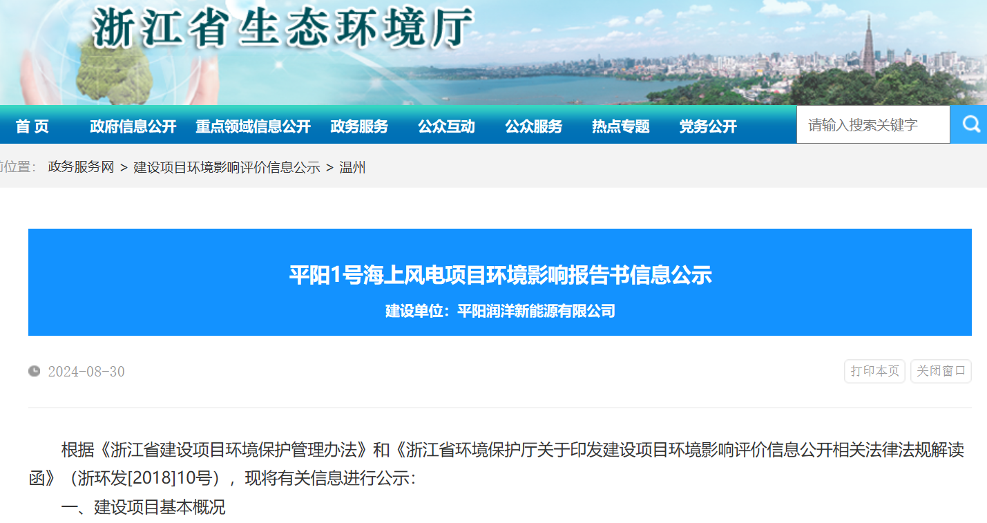 8月30日,浙江省生态环境厅发布《平阳1号海上风电项目环境影响报告书信息公示》。