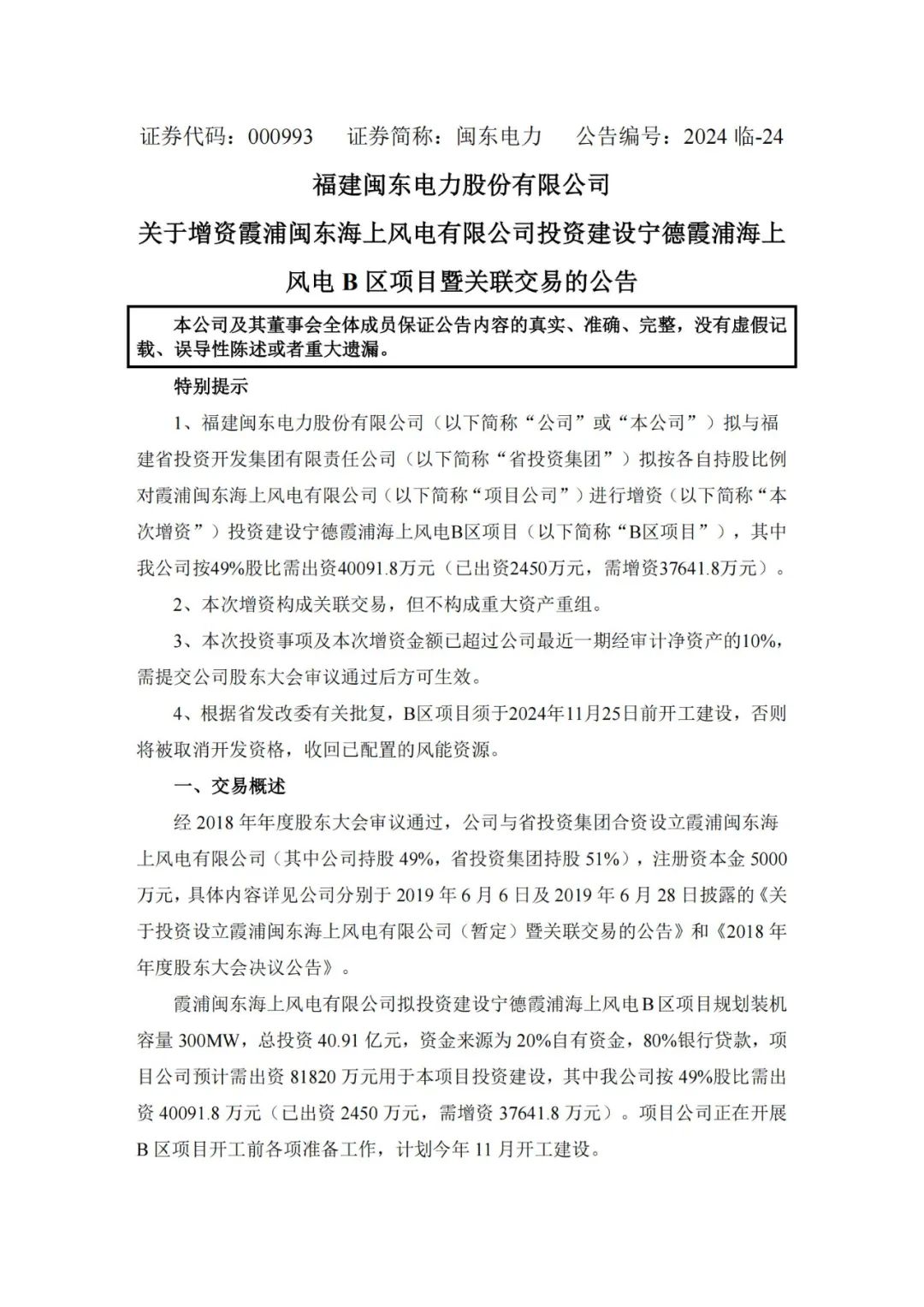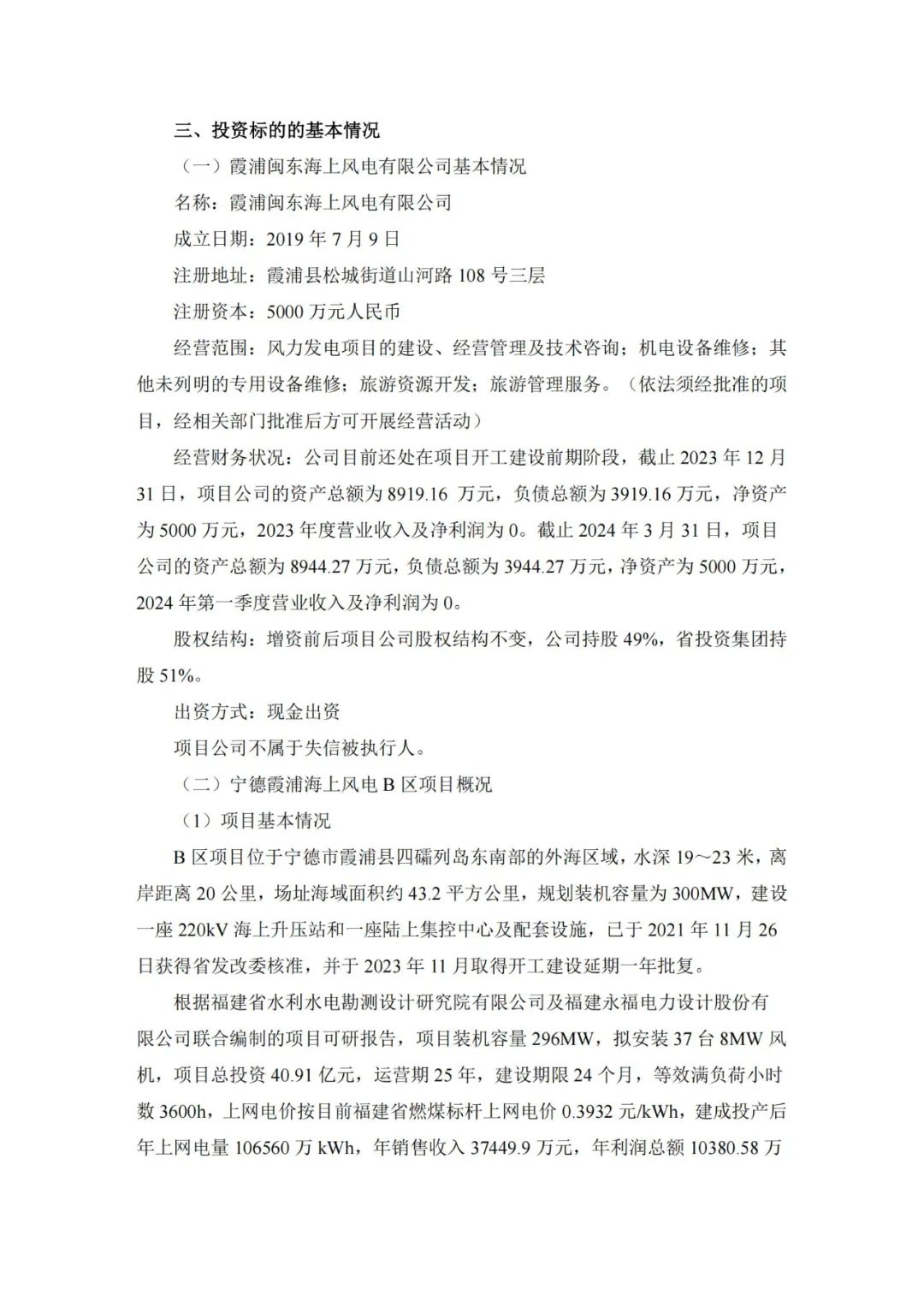 7月9日,福建闽东电力股份有限公司(简称:闽东电力)发布关于增资霞浦闽东海上风电有限公司投资建设宁德霞浦海上风电B区项目暨关联交易的公告。