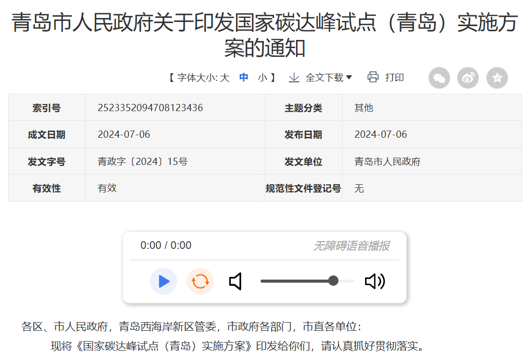 近日,山东省青岛市人民政府发布关于印发《国家碳达峰试点(青岛)实施方案》的通知。