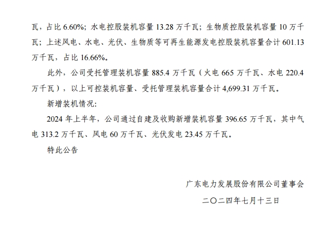 近日,粤电力A发布广东电力发展股份有限公司关于2024年上半年发电量完成情况的自愿性信息披露公告。