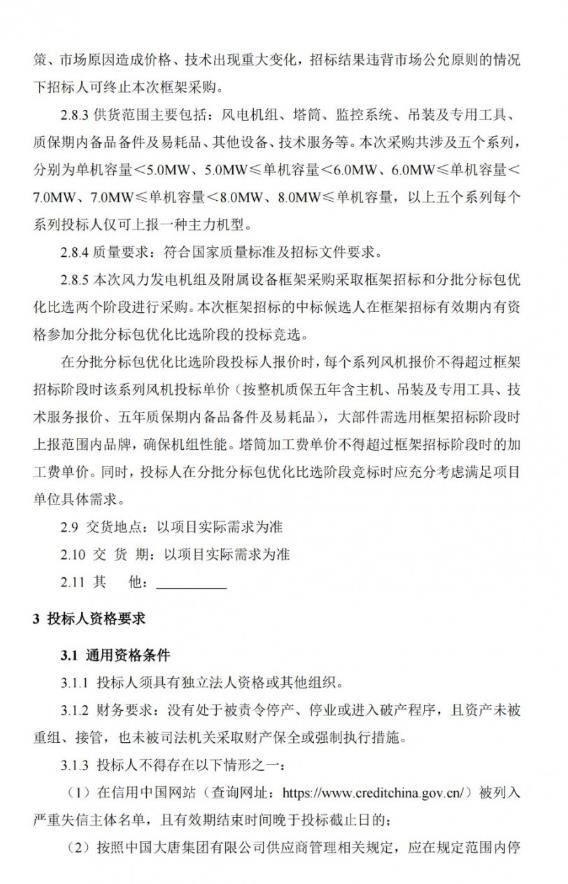 本次采购共涉及五个系列,分别为单机容量5.0MW、5.0MW单机容量6.0MW、6.0MW单机容量7.0MW、7.0MW单机容量8.0MW、8.0MW单机容量,以上五个系列每个系列投标人仅可上报一种主力机型。