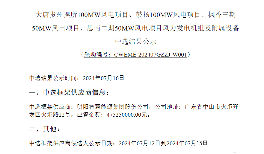 【大唐贵州摆所100MW风电项目、鼓扬100MW风电项目、枫香三期50MW风电项目、思南二期50MW风电项目风力发电机组及附属设备】中选结果公示