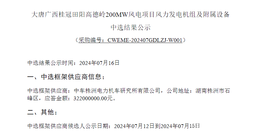【大唐广西桂冠田阳高德岭200MW风电项目风力发电机组及附属设备】中选结果公示