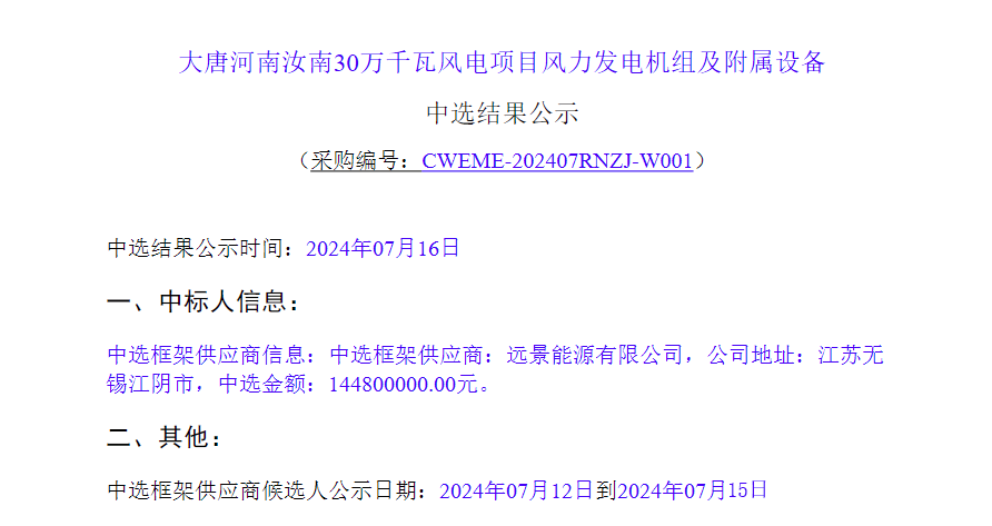 【大唐河南汝南30万千瓦风电项目(一期10万千瓦工程)风力发电机组及附属设备】中标结果公示