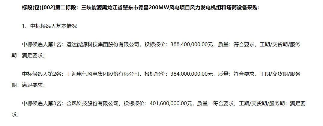 公告显示,第一中标候选人:运达能源科技集团股份有限公司,投标报价:388,400,000.00元。第二标候选人:上海电气风电集团股份有限公司,投标报价:384,000,000.00元。第三中标候选人:金风科技股份有限公司,投标报价:401,600,000.00元。