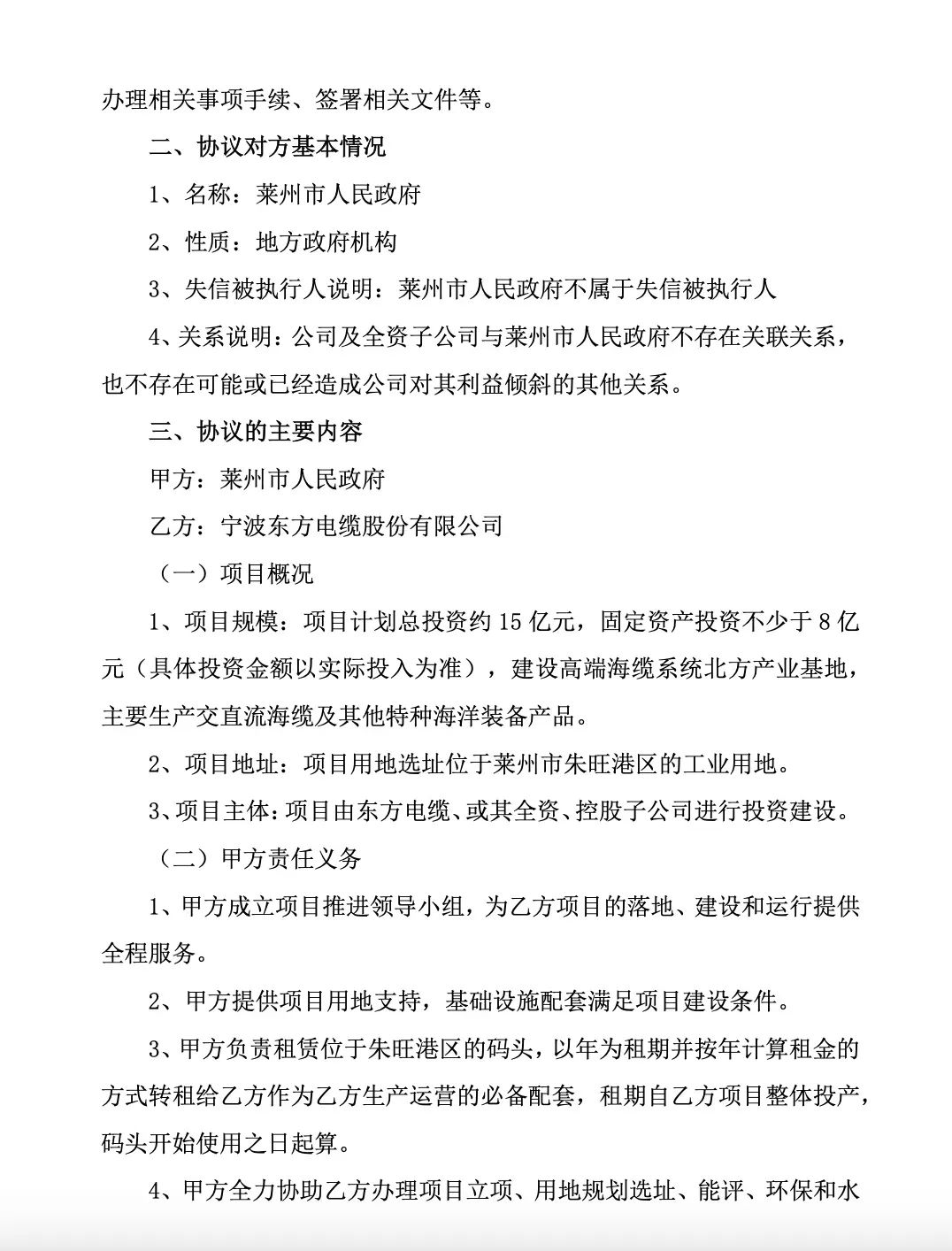 事实上,早在6月4日,东方电缆已经发布《东方电缆关于拟签订投资合作协议的公告》,显示出其布局山东海上风电市场的规划。据《公告》表示,公司拟于莱州市人民政府签订《投资合作协议》,拟在山东烟台莱州市投资建设高端海缆系统北方产业基地项目(暂定名),项目总投资约15亿元(预算金额)。